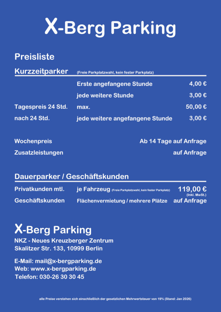 Parkhaus Kreuzberg | x-berg Parking Skalitzer Str. 133 | 10999 Berlin | Telefon: 030-26 30 30 45 | E-Mail: info@x-bergparking.de